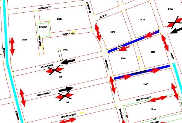 • Μονοδρόμηση της οδού Ατλαντίδος από την οδό Ακαδημίας μέχρι την οδό Αχιλλέως (Ο.Τ. 246Α, Ο.Τ. 235) με φορά κίνησης από οδό Ακαδημίας προς την οδό Αχιλλέως