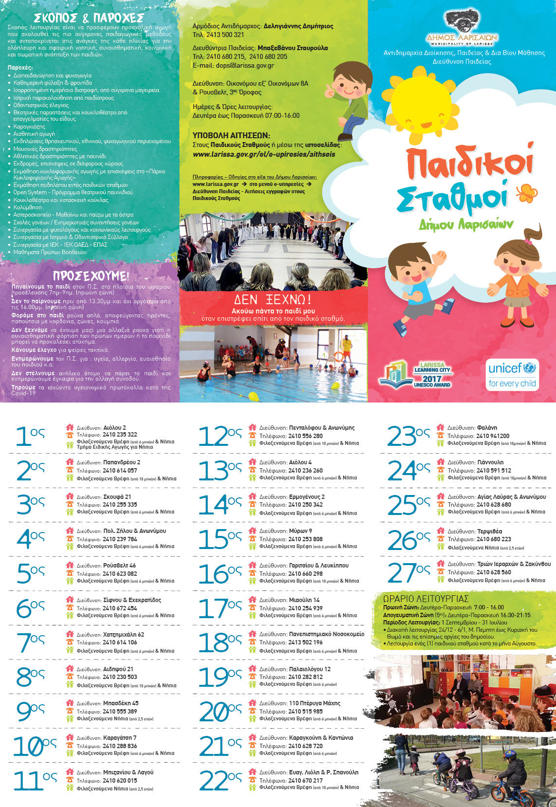 Στο Δήμο Λαρισαίων λειτουργούν 27 Παιδικοί Σταθμοί φιλοξενώντας παιδιά ηλικίας από 6 μηνών έως την εγγραφή τους στην υποχρεωτική εκπαίδευση.