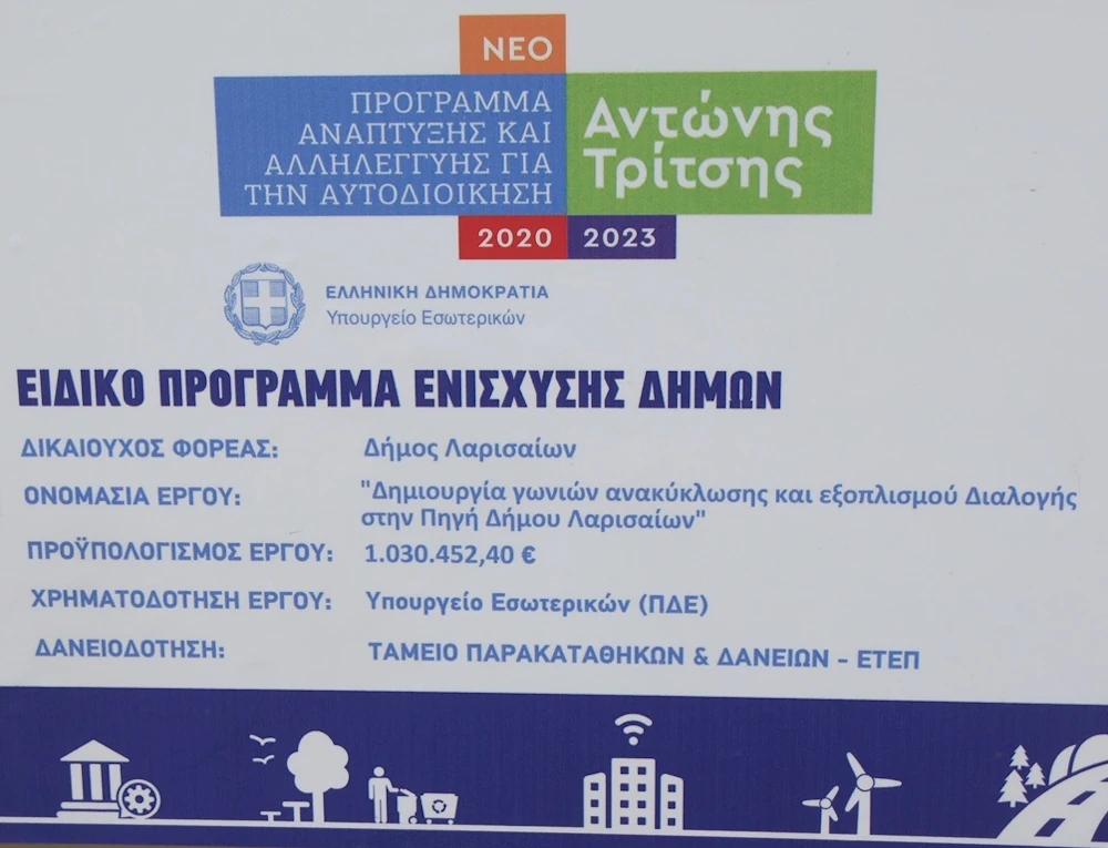Το έργο «Δημιουργία γωνιών ανακύκλωσης και εξοπλισμού Διαλογής στην Πηγή Δήμου Λαρισαίων», προϋπολογισμού 1.030.452,40€, έχει χρηματοδοτηθεί από το “Πρόγραμμα Αντώνης Τρίτσης, ΑΤ04”.