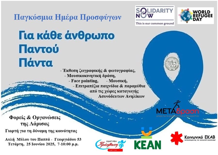 Ανοιχτή εκδήλωση με αφορμή την Παγκόσμια Ημέρα Προσφύγων (γιορτάζεται κάθε χρόνο στις 20 Ιουνίου), διοργανώνουν φορείς και οργανώσεις που δραστηριοποιούνται στην πόλη της Λάρισας, υπό την αιγίδα της Αντιδημαρχίας Πολιτισμού του Δήμου Λαρισαίων, την Τετάρτη, 25 Ιουνίου 2025, στην αυλή του Μύλου Παππά και ώρες 7:00μ.μ. με 10:00 μ.μ.. Στόχος της εκδήλωσης είναι η προώθηση της αλληλεγγύης, της καταπολέμησης των στερεοτύπων και διακρίσεων και της αλληλεπίδρασης με την τοπική κοινωνία, της ενημέρωσης και ευαισθητοποίησης του κοινού για τις δυσκολίες που αντιμετωπίζουν οι πρόσφυγες σε όλο τον κόσμο και την ανάγκη προστασίας τους.