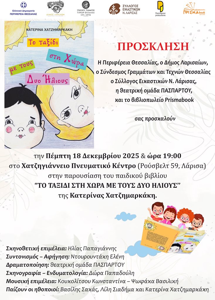Το πρώτο παιδικό βιβλίο της Κατερίνας Χατζημαρκάκη «ΤΟ ΤΑΞΙΔΙ ΣΤΗ ΧΩΡΑ ΜΕ ΤΟΥΣ ΔΥΟ ΗΛΙΟΥΣ», παρουσιάζουν την Πέμπτη 18 Δεκεμβρίου 2025 και ώρα 19:00 στο Χατζηγιάννειο Πνευματικό Κέντρο Λάρισας (Ρούσβελτ 59), η Περιφέρεια Θεσσαλίας, ο Δήμος Λαρισαίων, ο Σύνδεσμος Γραμμάτων και Τεχνών Θεσσαλίας, ο Σύλλογος Εικαστικών Ν. Λάρισας, η θεατρική ομάδα ΠΑΣΠΑΡΤΟΥ και το βιβλιοπωλείο ΠΡΙΣΜΑ. Πρόκειται για μία διαφορετική παρουσίαση που θα απολαύσουν μικροί και μεγάλοι.