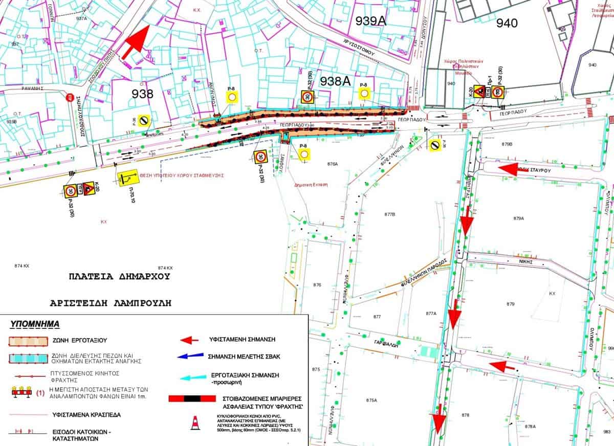 και β) Γεωργιάδου (κατεύθυνση από την οδό έναντι της ανώνυμης οδού [μεταξύ των ΟΤ 938 & 938 Α και πριν την οδό Ξάνθου] προς την οδό Φιλελλήνων θα γίνεται σε μία λωρίδα κυκλοφορίας πλάτους 3,50 μ έως 4,30 μ (τοπική μείωση των λωρίδων κυκλοφορίας από δύο σε μία, από 3,30μ/3,30μ ανά λωρίδα σε 3,60μ/4,25μ), λόγω της στένωσης του οδοστρώματος στην δεξιά πλευρά της οδού σύμφωνα με την κίνηση των οχημάτων από την οδό έναντι της ανώνυμης οδού [μεταξύ των ΟΤ 938 & 938 Α και πριν την οδό Ξάνθου] προς την οδό Φιλελλήνων, επιτρέποντας την αριστερή στροφή προς την οδό Διονύσου και δημιουργώντας πρόσθετη λωρίδα πλάτους 2,75μ)